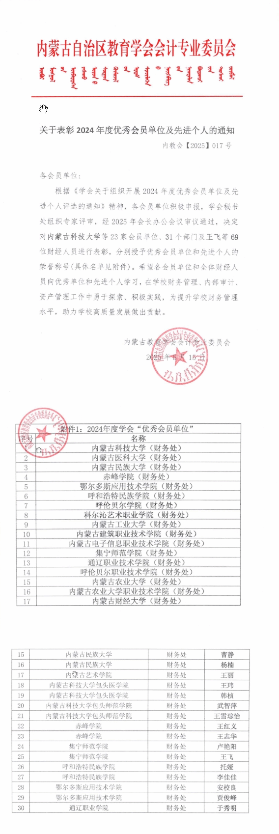 近日,内蒙古自治区教育学会会计专业委员会表彰了2024年度“优秀会员单位”和“优秀个人”,经单位申报、专家评审、会计专业委员会会长会议审议,pp电子计划财务处荣获了2024年度“优秀会员单位”称号,同时,计划财务处2名同志被评为2024年度“先进个人”。