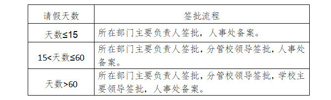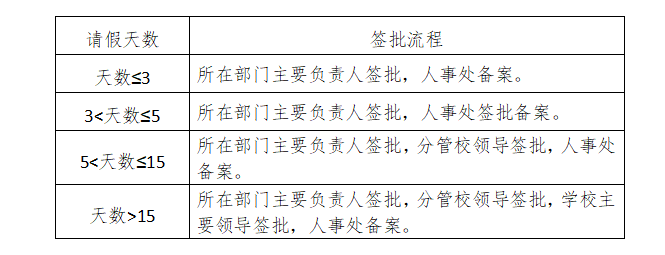 (三)请假人需填写《pp电子官方网站教职工请假审批表》,并按要求提供证明材料,按照准假权限批准后方可生效。未经批准的,擅自离岗或经批准但假满未归的,且又未及时办理续假者,其超出天数按旷工处理。