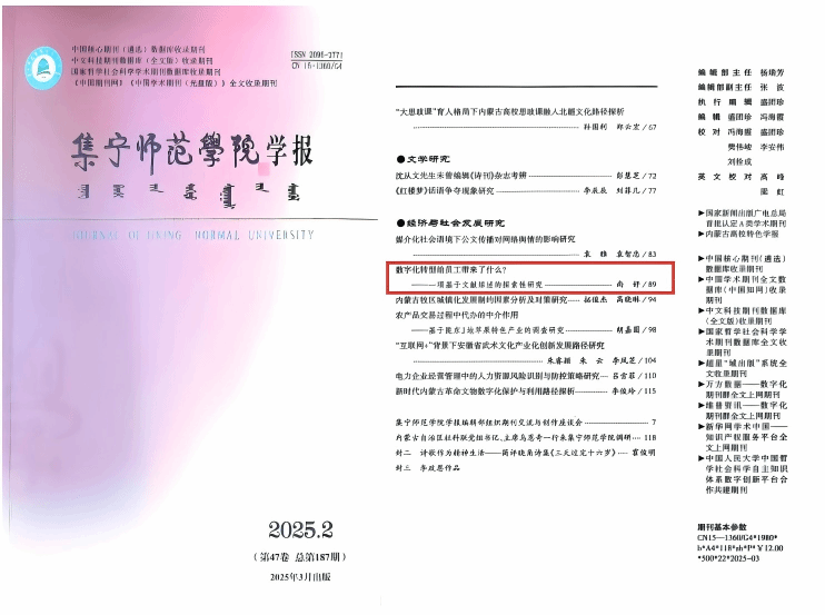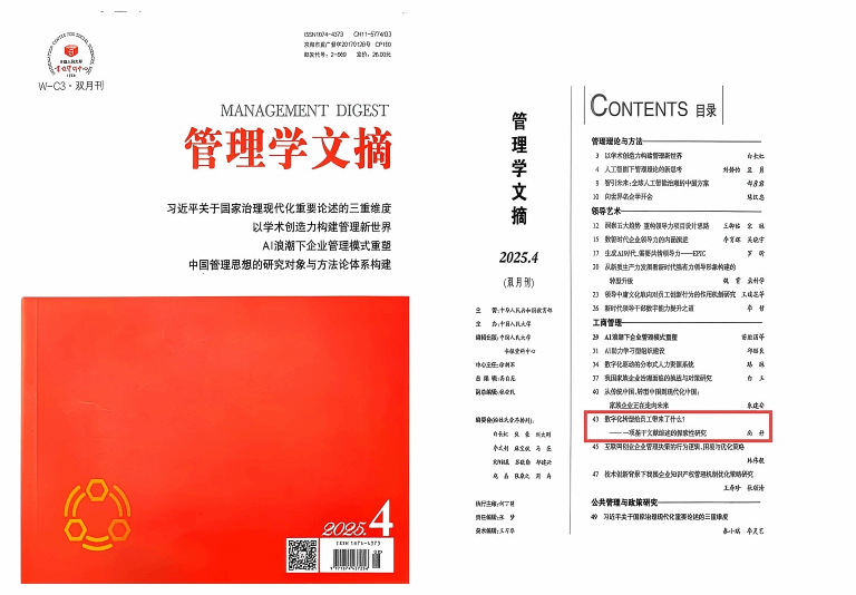 发表于《pp电子官方网站学报》(2025年第2期)的文章《数字化转型给员工带来了什么?——一项基于文献综述的探索性研究》被人大复印报刊资料《管理学文摘》(2025年第4期)全文转载,文章作者为pp电子官方网站经济与管理学院副教授、科技处副处长尚妤博士。