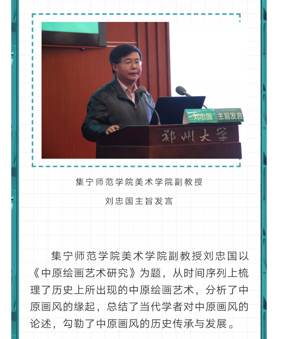2019年11月30日—12月1日,pp电子官方网站美术学院教师刘忠国和王军一行,参加了由郑州大学和高等教育出版社等单位联合主办的2019第六届“中原美术”学科建设学术研讨会。会议有省内外60多所高校的知名学者、艺术家和研究生等六百多人,我院副教授刘忠国老师,以《中原绘画艺术研究》为题在大会上做了演讲,他从时间序列上梳理了历史上所出现的中原绘画艺术,分析了中原画风的缘起,总结了当代学者对中原画风的论述,勾勒了中原画风的历史传承与发展。该议题得到了与会专家教授的一致好评,河南省艺术教育学会会长石品先生,还专门找刘老师建立了个人微信联系方式,并感谢其热心关注河南美术事业的发展,感谢其对中原绘画艺术的研究。