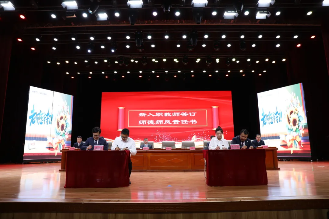 张宝成,周建华与2025年新入职教师代表签订师德师风责任书。