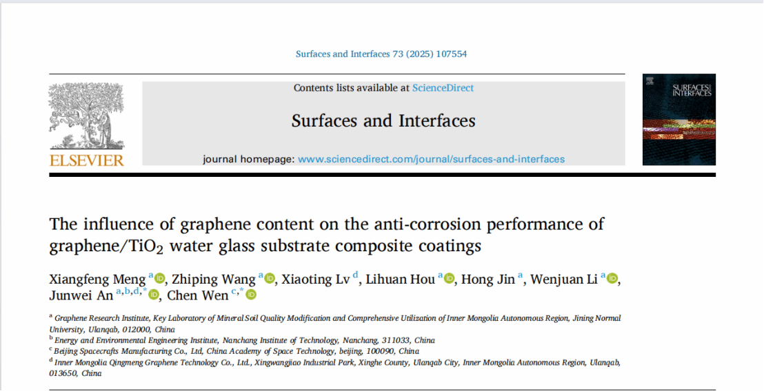 近日,石墨烯研究院安军伟教授团队在防腐涂料研究中再次取得重要进展,相关研究成果以“The influence of graphene content on the anti-corrosion performance of graphene/TiO2 water glass substrate composite coatings”(论文链接:https://doi.org/10.1016/j.surfin.2025.107554)为题发表于涂层与薄膜领域知名期刊《Surfaces and Interfaces》。该研究由孟祥锋副教授担任第一作者,安军伟教授为通讯作者。