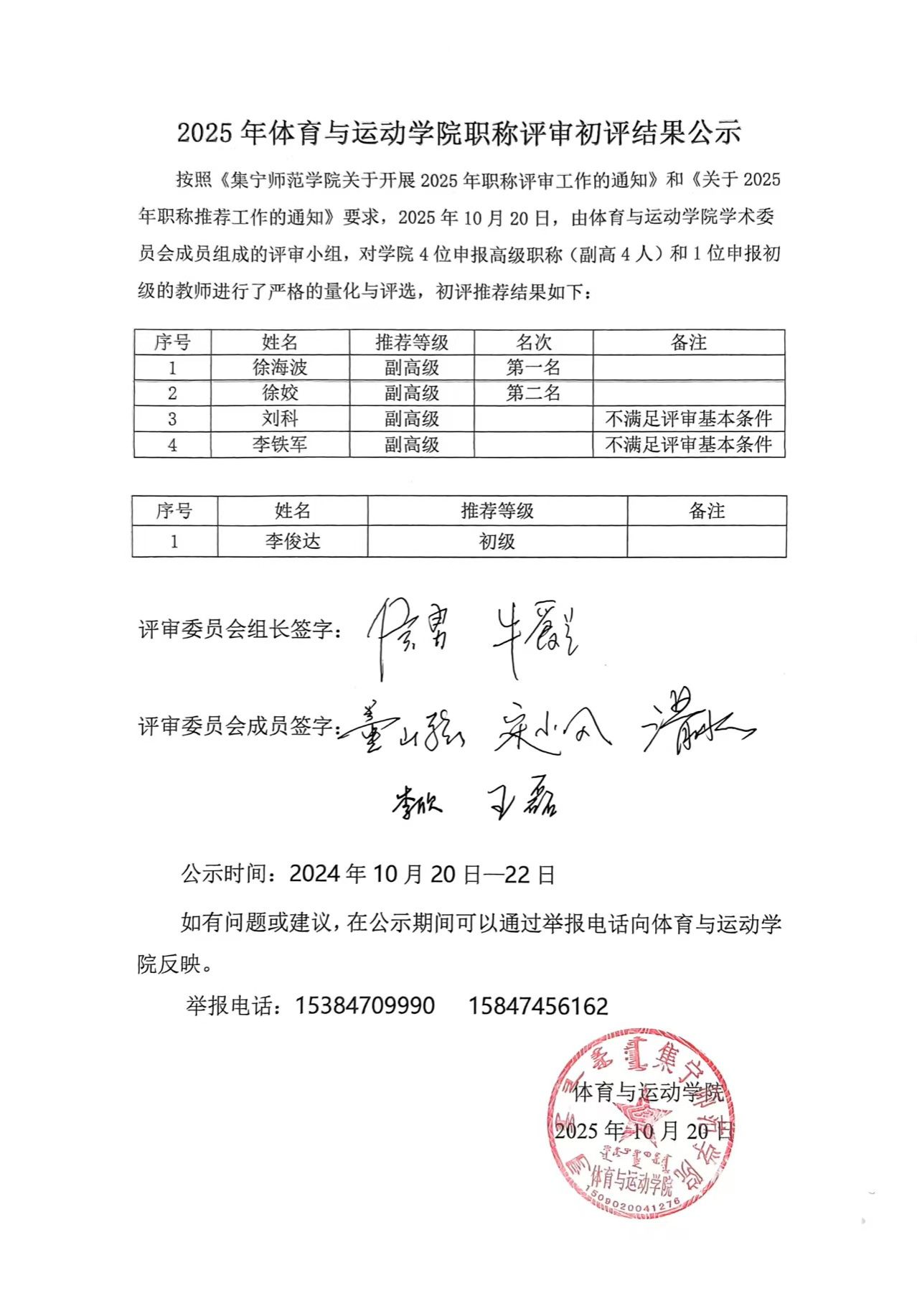 2025年度体育与运动学院职称评审初评结果公示
