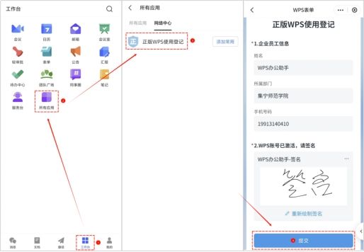 通过微信登录,在工作台→所有应用→正版WPS使用登记,完成签名登记。