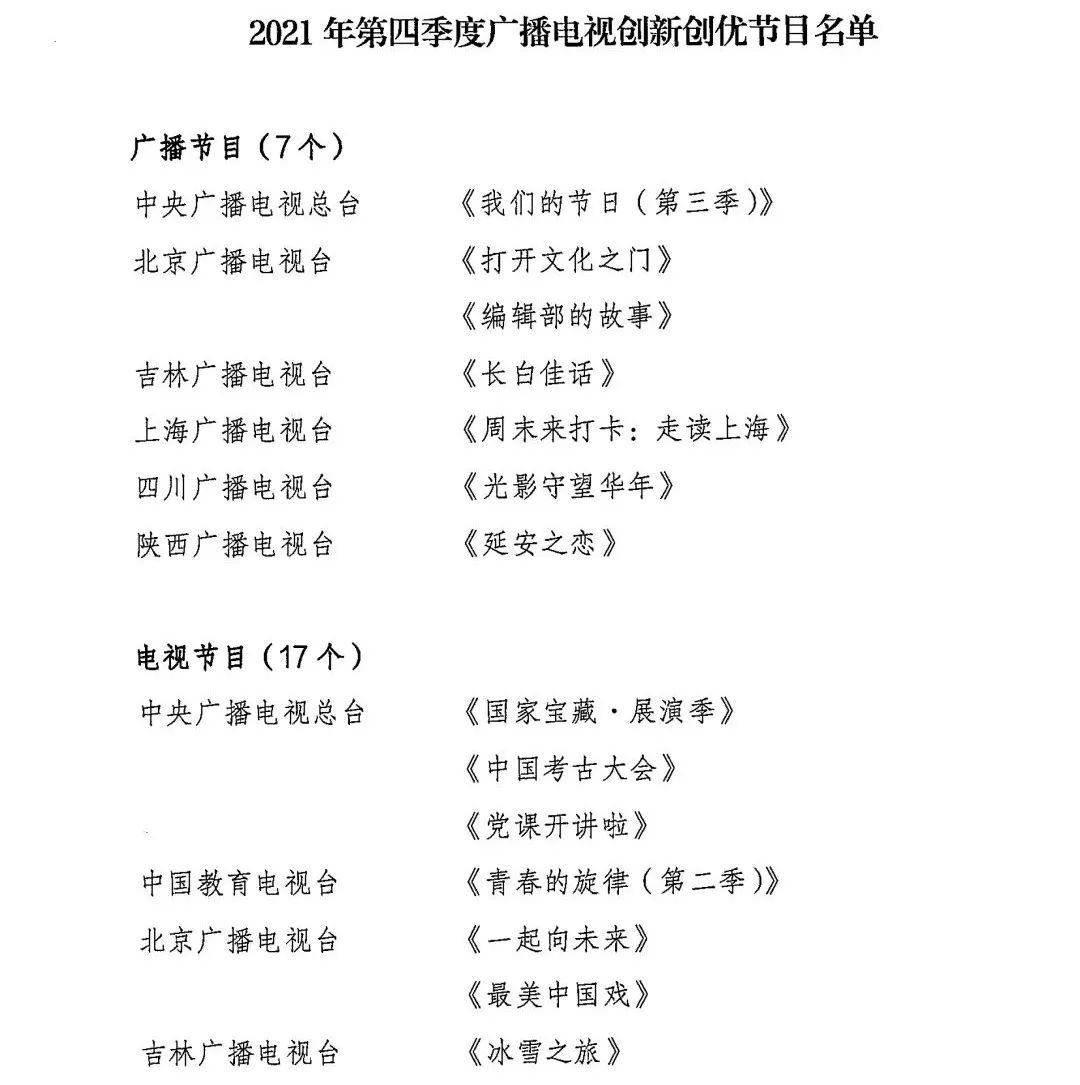 近日,经广电总局组织评选,确定中央广播电视总台《我们的节日(第三季)》、北京广播电视台《打开文化之门》等7个广播节目,中央广播电视总台《国家宝藏·展演季》、湖南广播电视台《再次见到你》等17个电视节目为“2021年第四季度广播电视创新创优节目”。
