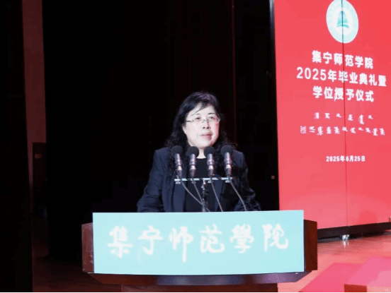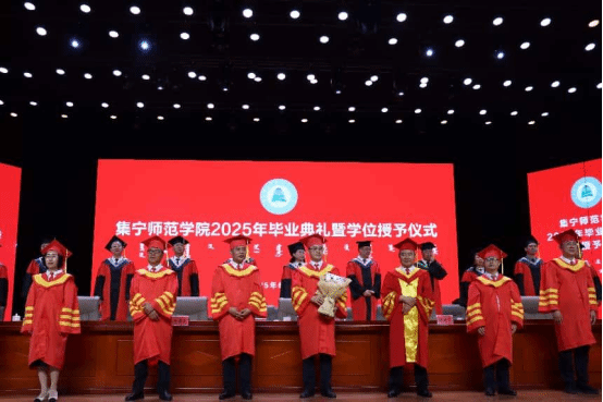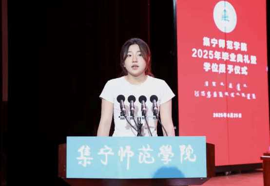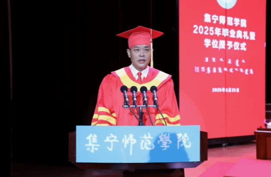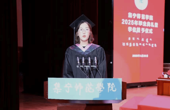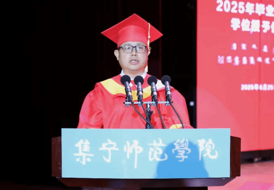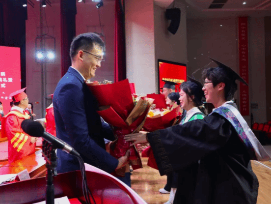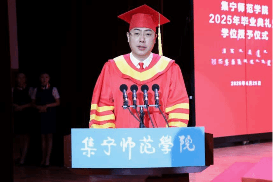 教师代表王汉君教授深情回顾了2025届毕业生校园学习生活的点点滴滴,他对毕业生提出三点期许:一愿思想长青;二愿知行合一;三愿初心永驻。王老师以歌声作别,愿同学们此去前程似锦,每一步都奔向光明!