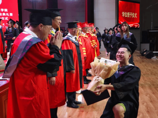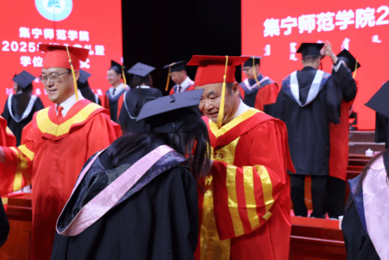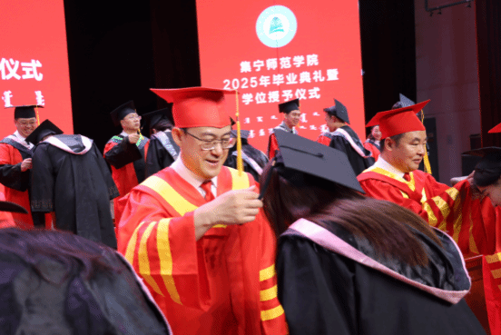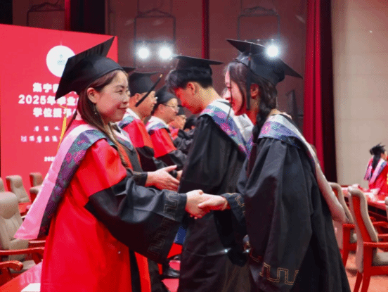学位授予环节,校领导、学位评定委员会委员一同为毕业生拨穗正冠、颁授学位。
