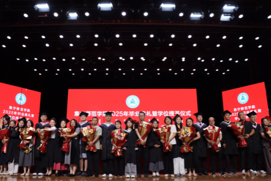 从集师新生到集师校友,同学们成长成才的背后,凝聚着无数人的默默奉献。典礼上,毕业生代表向教师代表,辅导员、班主任代表,后勤保障服务人员代表献花,表达诚挚的谢意。